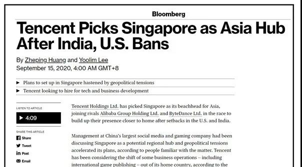 9月15日,繼阿里巴巴和字節(jié)跳動之后,騰訊集團也選擇在新加坡設立其在亞洲其他地區(qū)的橋頭堡。